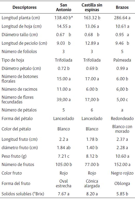 Tabla 2 Valores promedios de Los descriptores morfológicos cualitativos y cuantitativos en tres cultivares de Rubus spp
