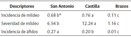 Se observa un porcentaje promedio de incidencia de áfidos mayor para los cultivares San Antonio y Castilla sin espinas con valores de 27 % y 20 %, respectivamente; mientras que para el cultivar Brazos se presenta el menor porcentaje de incidencia con un valor de 1 %. Teniendo en cuenta los resultados obtenidos, se puede decir que la incidencia de áfidos presenta un nivel bajo para el cultivar Brazos (< a 5 %), medio para Castilla sin espinas (< a 25 %) y alto para San Antonio (> a 25 %).