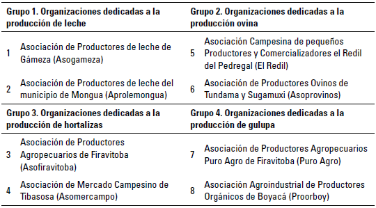 A través de la base de datos publicada en la página del Instituto Colombiano de Bienestar Familiar (ICBF) en la sección "Estrategia de compras locales", se obtuvieron los datos generales de 24 asociaciones de productores agropecuarios ubicadas en la provincia del Sugamuxi (ICBF 2020); se escogió la anterior en atención a la definición de las necesidades de demanda tecnológica del departamento soportadas por el portal institucional Siembra, ya que esta base de datos es la más robusta y actualizada. A continuación, se realizó filtrado para seleccionar las organizaciones por tipo de producto, teniendo en cuenta la priorización de los encadenamientos productivos del departamento de Boyacá y la plataforma tecnológica de ciencia, tecnologia e innovación del sector agropecuario colombiano (Siembra.gov.co), donde se evidenciaron demandas tecnológicas por atender, lo que arrojó como resultado cuatro grupos. 1. productores de leche, 2. productores de ovinos, 3. productores de hortalizas y 4. productores de frutales.