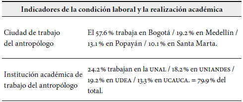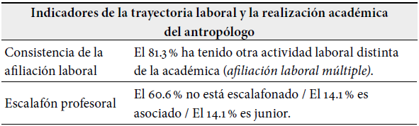 Tabla 3 Indicadores de la trayectoria laboral y la realización académica del antropólogo