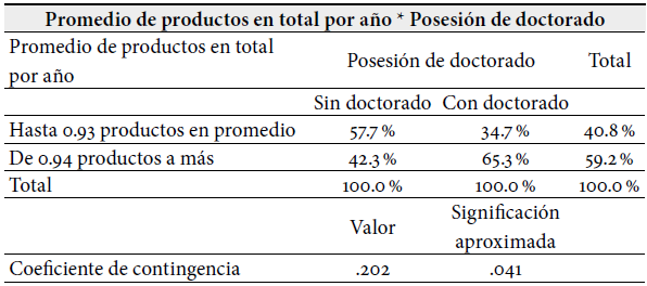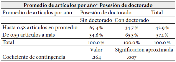 Los denominados indicadores de "productividad académica" también resultan muy bien explicados por la posesión de doctorado (Tablas 14 a 16). Dentro del concepto de realización material escrita, el doctorado dota de productividad. La pauta ahi es que, en las categorias de mayor productividad, "De 0.59 articulos a más" (Tabla 14), "De uno a más articulos en promedio" (Tabla 15) y "De 0.94 escritos a más por año" (Tabla 16) siempre es más probable encontrar mayor cantidad de personas que tienen doctorado.