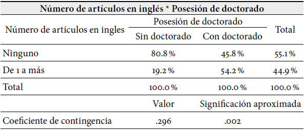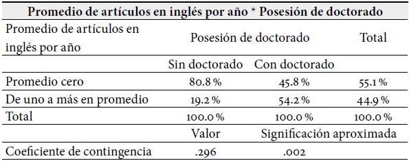 Tabla 15 Promedio de artículos en inglés por año * Posesión de doctorado