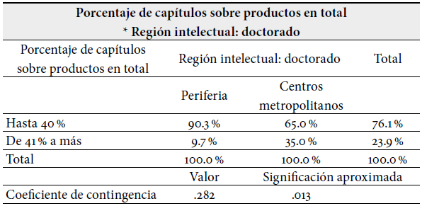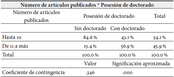 Las Tablas 12 y 13, por su parte, sugieren la existencia de un fenómeno de gran interés. Es uno que está asociado con lo que lineas arriba denominamos indicadores de las estrategias de realización académica de los actores. Estas tablas comprueban que es más probable encontrar a quienes tienen doctorado en las categorias donde el total de articulos publicados representa un alto porcentaje sobre el total de su realización material escrita. Es como decir que hay un matrimonio entre tender más a publicar articulos y poseer este grado académico (los que tienen doctorado en la categoria de "De 41 % a más" representan el 72.2 % de los casos). Similar pauta no se observa con los capitulos de libros (solo el 23.9 % de quienes tienen doctorado). Particularmente, llama la atención que el porcentaje de libros publicados sobre el total de realización material escrita no quedara como una asociación estadisticamente significativa. Sin embargo, y como conclusión, podria pensarse que, para quien posee un doctorado, publicar libros quizás sea considerado menos realizativo. También podria pensarse que, en la actualidad, el doctorado capacita más para la publicación de articulos que de libros y capitulos de libros. Además, no hay duda de que, en esta correlación, la diferencia generacional y los estilos de trabajo de cada generación tienen un papel.
