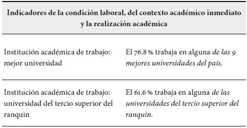 Tabla 2 Indicadores de la condición laboral, del contexto académico inmediato y la realización académica