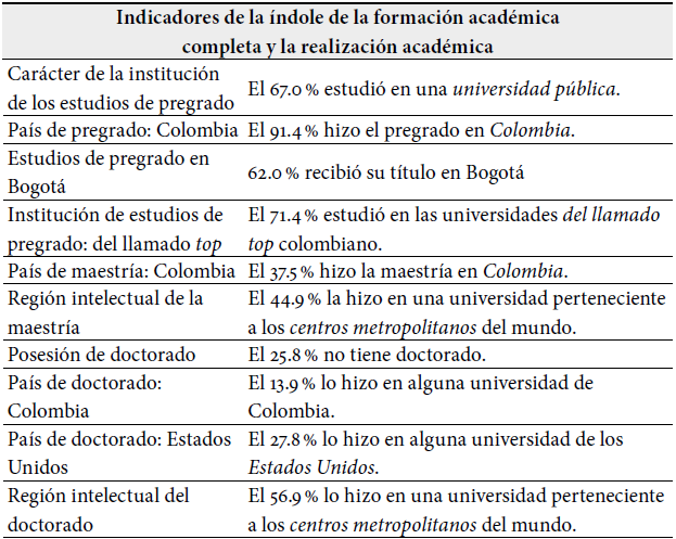 Como lo ya lo hemos sostenido, trasformamos en datos cuantitativos en el marco de nuestra conceptualización y operacionalización la infor-mación en bruto que tomamos de los curriculos CVLAC. Con respecto a la dimensión "Trayectoria de formación académica y laboral", la operacionalizamos en catorce indicadores: cinco relacionados con la formación de pregrado, la formación disciplinar y la formación múltiple, pais y ciudad de la institución que otorgó el titulo, asi como el carácter juridico de la institución (pública o privada); otros seis indicadores tienen que ver con la formación de posgrado (pais y región intelectual de la maestria, posesión de doctorado, pais y región intercelular de la maestria). La trayectoria laboral, a su vez, contiene tres indicadores: ciudad de trabajo, institución académica de trabajo y ámbitos laborales de desempeño.