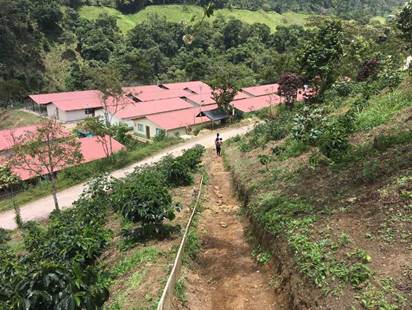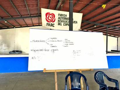 Uno de los principales proyectos del ETCR es el de procesamiento de café. En el centro del espacio de capacitación hay un tablero, donde están escritas unas palabras que no habían borrado de un curso de capacitación que habían recibido algunos de ellos el día anterior (Figura 8). Como se aprecia en la imagen, estas se relacionan con productos derivados del café. Algunos firmantes recibieron capacitación en temas de barismo y catación, en cursos impartidos por Asopep. Detrás del tablero había una pancarta con el nombre del partido político emergente del Acuerdo, con el símbolo de la rosa, que reafirmaba la identidad de los firmantes y su nueva condición de miembros de un partido. El tablero refleja los procesos de aprendizaje en que están inmersos e indica el proceso de aprendizaje e inserción en la economía cafetera. La lógica espacial del modo de producción capitalista en la región llevó al aumento de la producción, dirigida a la exportación de cafés especiales, en la cual se ha buscado insertar a los firmantes (Entrevista 6).