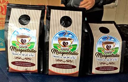 Ciertamente, uno de los principales proyectos de la reincorporación manejado a través de la Cooperativa Multiactiva Marquetalia Por Un Mundo Mejor (Comumarfu)- ha sido la vinculación de los firmantes y sus familias a la economía del café. A nivel local, se ha estructurado una alianza estratégica con Asopep, que tiene experiencia en el mercado nacional e internacional. Algunos habitantes del ETCR van a trabajar como jornaleros en las fincas vecinas (Diario de campo 2; Entrevista 9). Y como indicó un líder de la región (Entrevista 11): "el aislamiento de Planadas debido al conflicto armado, produjo que los habitantes tuvieran que solucionar sus cosas sin esperar respuestas del Estado". La población local aprendió sobre el cultivo y procesamiento del café, y ese proceso se fortaleció antes del Acuerdo de Paz. Los habitantes del ETCR crearon la marca Marquetalia (Figura 9), con café cultivado en fincas de vecinos, y ha sido empacado y comercializado por los firmantes.