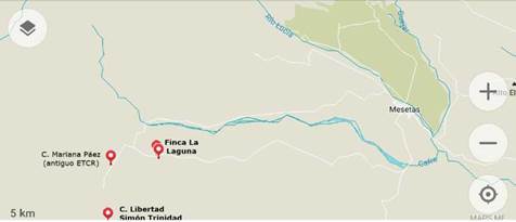 Figura 1 Mapa de referencia. Ubicación del Campamento Simón Trinidad, el Campamento Mariana Páez y la finca La Laguna, lugar donde los exguerrilleros del Simon Trinidad tienen el proyecto productivo porcícola Porcipaz.