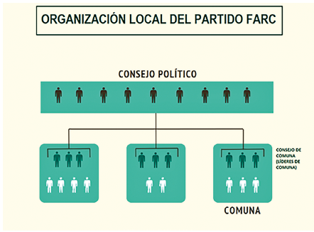 Según los estatutos del Partido (Partido FARC 2017), todos sus militantes deben hacer parte de una comuna, que es la célula básica del Partido. Las comunas surgieron con la formación del partido politico, no hacian parte de la organización de la estructura armada ni de las agrupaciones carcelarias; deben estar representadas por entre 7 y 9 delegados que conforman un Consejo Politico o Consejo Local. Cada comuna cuenta con tres lideres, una especie de enlace entre los habitantes de las comunas y el Consejo Politico. En el Simón Trinidad hay un Consejo Politico y tres comunas, cada una con sus respectivos lideres, las comunas a su vez tienen una ubicación espacial en los módulos de viviendas de asbesto. Los miembros del Consejo Politico son quienes toman las decisiones que atanen a los temas politicos, además de regular la convivencia dentro del espacio y liderar la organización de las actividades comunes. Los conflictos interpersonales del espacio se dirimen a través del Consejo Politico.