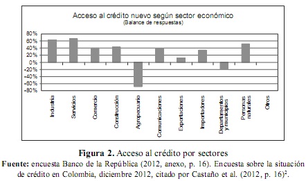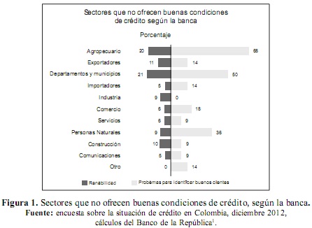 1 Cálculos de acuerdo con los resultados de la encuesta sobre la situación de crédito en Colombia, realizada por el Banco de la República a las diferentes instituciones financieras en marzo 2012: el 30 % de las entidades bancarias consideró el sector agropecuario como el menos rentable y, de forma más crítica, el 90 % de los encuestados argumentó que este es el que más dificultades presenta para identificar clientes potenciales (Castaño, Estrada & Patiño, 2012, p. 7).2 Durante el cuarto trimestre de 2012, el acceso al crédito de los diferentes sectores ha presentado un comportamiento mixto. Los bancos indican que se ha dado una disminución en la mayoría de los sectores: en particular se observa que la industria y los servicios (los principales sectores para este grupo de intermediarios), junto con los departamentos y municipios, mostraron importantes reducciones. Por su parte, las CFC y las cooperativas consideran que en general el acceso al crédito se ha incrementado para la mayoría de los sectores, especialmente para la industria y los servicios. Vale la pena resaltar que los tres grupos de intermediarios consideran que el sector agropecuario continúa siendo el que presenta mayores restricciones, y en el último trimestre del año empeoró su acceso al crédito en comparación con trimestres anteriores.