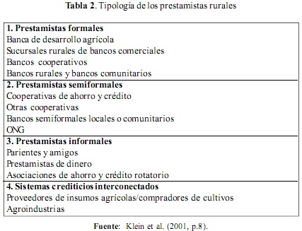 Klein, B., Meyer, R., Hannig, A, Burnett, J. & Fiebig, M(2001). Mejores prácticas del financiamiento agrícola. Replanteamiento de las finanzas agrícolas. Organización de las Naciones Unidas para la Agricultura y la Alimentación -FAO-, Deutsche Gesellschaft für Technische Zusammenarbeit -GTZ-, (3), 1-102. [ Links ]