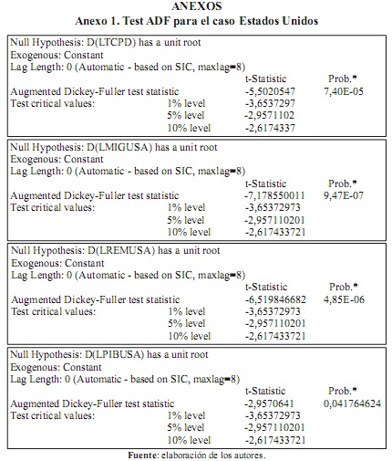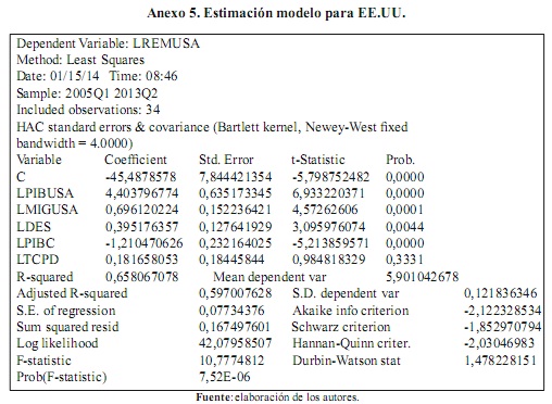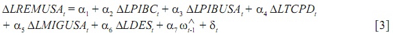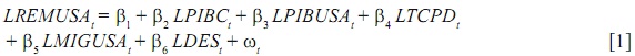 Donde LREMUSA son las remesas enviadas a Colombia desde Estados Unidos, LPIBC es el PIB de Colombia, LPIBUSA el PIB de EE.UU., LTCPD denota el tipo de cambio real peso-dólar, LMIGUSA son emigrantes colombianos a EE.UU., y LDES recoge el desempleo en Colombia. Finalmente, ωt es una variable aleatoria que se supone cumple con los supuestos estadísticos clásicos, y que recoge la influencia de otras variables que no han sido tenidas en cuenta al momento de explicar el envío de remesas desde Estados Unidos a nuestro país. Cabe resaltar que todas las variables están expresadas en logaritmos, por tanto los parámetros se deben entender como elasticidades.