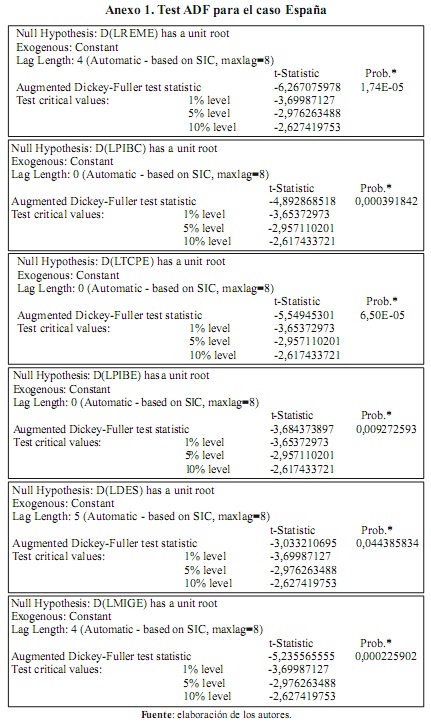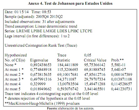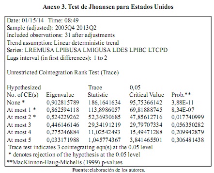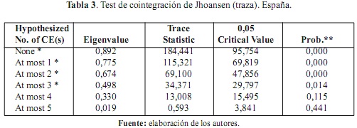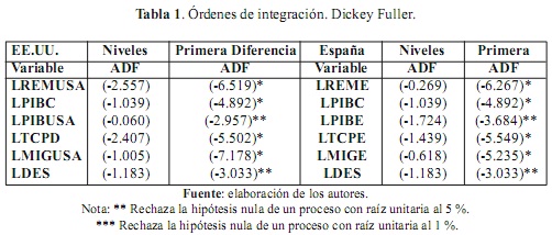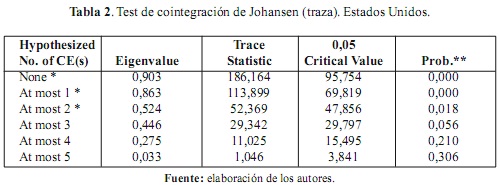 La prueba muestra que las series en niveles, tanto para Estados Unidos como para España, presentan raíces unitarias para todas las series analizadas, es decir, son caminatas aleatorias. En primeras diferencias, todas las series se transforman en estacionarias y por tanto se concluye que son integradas de orden uno, o I(1). Lo anterior indica que se puede implementar un análisis de cointegración, toda vez que las series presentan el mismo grado de integración. Para tal efecto se utilizará el test de Johansen.
