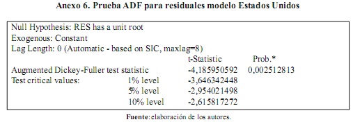 Igual que en el caso anterior, los parámetros fueron estimados bajo la corrección de Newey-West (HAC), por lo que su consistencia se mantiene ante los posibles problemas de heterocedasticidad y autocorrelación. Adicionalmente, la multicolinealidad también es muy baja entre los regresores, siendo de nuevo la más elevada la existente entre el desempleo y el PIB colombiano, aunque tan solo fue del 0,44 a partir de una matriz de correlaciones simples, no mostrada aquí. Finalmente, los residuales estimados para εt son estacionarios de acuerdo con la prueba ADF11.