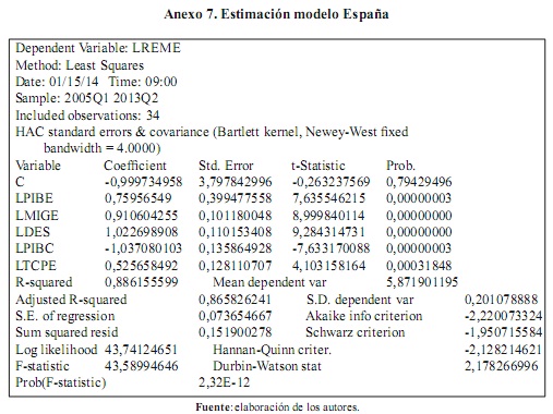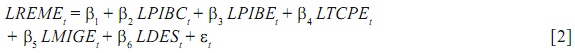 Donde LREME son las remesas enviadas a Colombia desde España, LPIBC es el PIB de Colombia, LPIBE el PIB español, LTCPE denota el tipo de cambio real peso-euro, LMIGE son emigrantes colombianos a España, y LDES recoge el desempleo en Colombia. Finalmente, εt es una variable aleatoria que se supone cumple con los supuestos estadísticos clásicos, y que recoge la influencia de otras variables que no han sido tenidas en cuenta al momento de explicar el envío de remesas desde España a Colombia. Vale la pena anotar que al igual que en el modelo anterior, todas las variables están expresadas en logaritmos, de tal forma que los parámetros se deben también entender como elasticidades6.