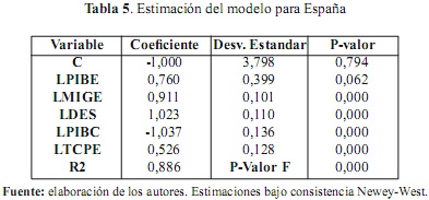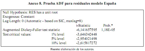 En el caso de España, se encuentra que el ajuste individual es bueno ya que los p-valores de los regresores son cercanos al cero y el nivel de significancia conjunto es alto de acuerdo con el R2 y al p-valor del estadístico F. El intercepto no cumple con lo anterior, pero se mantiene para garantizar que los residuales sean minimizados. El parámetro del PIB español es significativo también, pero al 6,2 % de acuerdo con su p-valor10. Frente a los signos esperados, todos son correctos.
