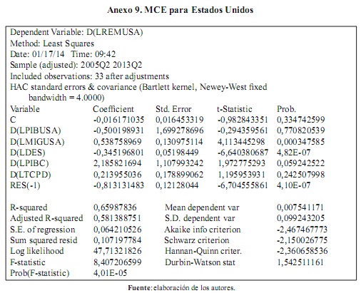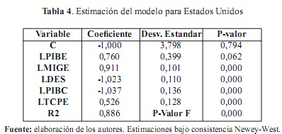 En el caso norteamericano, el modelo presenta un buen ajuste a nivel individual y agregado, toda vez que los p-valores son todos cercanos a cero y R2es elevado (65,9 %), y el p-valor del estadístico F es cero. La variable tipo de cambio real entre el peso y el dólar, no cumple con dicha significancia individual y por tanto no es relevante para el modelo. Frente a los signos esperados, todos son los correctos.