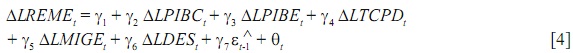 Donde Δ es la primera diferencia de la variable, εt-1 son los residuales del modelo cointegrante (ecuación 2) rezagados en un periodo, y θt denota los errores estocásticos que se supone están bien comportados. Como en el caso anterior, el yt es el coeficiente de error de equilibrio, el cual muestra la discrepancia del ajuste ente el corto y el largo plazo de las remesas.14