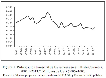 A partir de 2005, las remesas que ingresan a Colombia desde diferentes destinos han tenido una importancia considerable en el nivel de actividad económica. Como porcentaje del PIB, su participación trimestral pasó de ser del 0.3 % a casi el 0.45 %, de acuerdo con la Figura 1 en su etapa de auge, aunque en términos comparativos con el inicio de la década del nuevo milenio, estas han caído, pues se registraba una participación superior al 1 %, según el Banco Interamericano de Desarrollo -BID- (2007, p.16). Hay que destacar también que a partir del segundo trimestre de 2008 la participación ha sido cada vez menor, llegando tan solo al 0.24 % para el segundo trimestre de 2013.