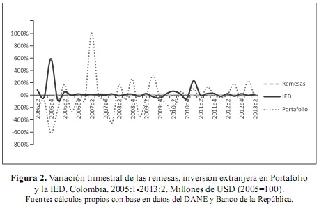 Las remesas se han constituido en ingresos permanentes para las familias receptoras, las cuales las destinan en general para consumo, ahorro e inversión. En el campo financiero, las remesas ocupan el 49.3 % de la inversión exterior directa -IED- en promedio para el periodo analizado. La estabilidad de las remesas en el tiempo, de acuerdo con sus tasas de variación, se hace evidente en la siguiente figura, frente a otras inversiones tanto de corto plazo (inversión extranjera en portafolio -IEP-) como de largo plazo (inversión exterior directa).