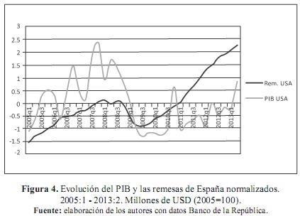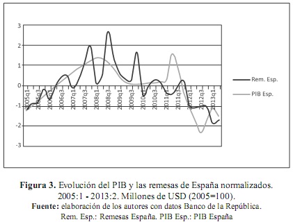 Lo que se espera de las variables analizadas independientemente del país que provengan, es que la relación entre las remesas y el PIB colombiano sea negativa, ya que si las cosas marchan bien a nivel de agregado en la economía colombiana, los extranjeros enviarán una menor cantidad de dinero, y viceversa, es decir que recesiones económicas internas amplían el flujo enviado de dinero del exterior. Frente al PIB del país desde donde se envían los giros, se supone que la relación es positiva, toda vez que si la actividad económica es buena afuera, hay más dinero para enviar remesas a nuestro país.
