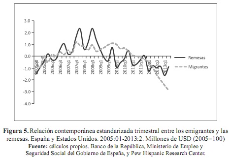 Los resultados mostraron, por lo menos gráfica y estadísticamente hablando, que la relación a largo plazo entre las remesas y el número total de emigrantes de España y Estados Unidos es moderadamente alta, toda vez que las correlaciones a nivel tanto contemporáneo como rezagado superan el valor de 0,62.