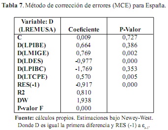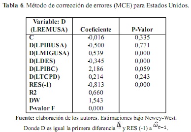 En el anterior acápite se mostró que existe una relación estable a largo plazo entre las remesas y las variables que las determinan, bajo dos escenarios, pero es muy probable que a corto plazo puedan surgir desequilibrios entre ellas. Por tal motivo se implementa un mecanismo de corrección de errores (MCE), apelando a Engle y Granger (1987), más específicamente al teorema de representación de Granger, el cual dice que si dos o más variables están cointegradas, entonces la relación se puede expresar como un MCE. Se estima a continuación un modelo de este tipo para cada país que trata de develar qué tan rápido o qué tan lento es el ajuste a la tendencia estable a largo plazo, los desequilibrios presentados a corto plazo.
