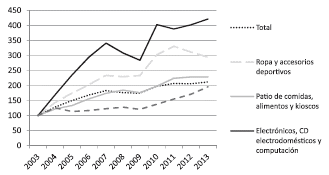 Por su parte, las figuras 3 y 4 son útiles para identificar cuáles fueron los rubros en los que se canalizó este aumento en el consumo privado. Si bien no dan cuenta de la descomposición total del mismo, muestran que tanto en los supermercados como en los centros comerciales el rubro de mayor crecimiento en el período seleccionado ha sido el de "electrónicos y artículos para el hogar" y "electrónicos, CD y electrodomésticos" respectivamente. Según datos del Indec (2015c, 2015a), en los supermercados las ventas de estos artículos pasaron del 3.43 % en 2003 al 7.04 % en 2013 como porcentaje del total de ventas, mientras que en los centros comerciales aumentaron del 9.7 % en 2003 al 19.3 % en 2013.