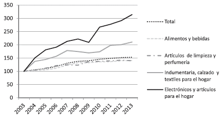 Figura 3 Evolución anual de las ventas por grupos de artículos en centros comerciales a precios constantes, 2003-2013. Índice 2003=100