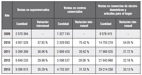 Tabla 1 Ventas de electrodomésticos y artículos para el hogar en supermercados, centros comerciales y comercios especializados en Gran Buenos Aires, 2009-2013. Valores en unidades