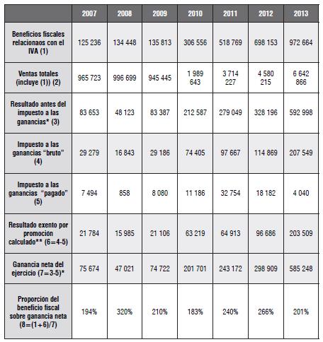 Tabla 10 Cálculo del peso del beneficio fiscal sobre la ganancia neta, 20072013 Valores en miles de pesos corrientes