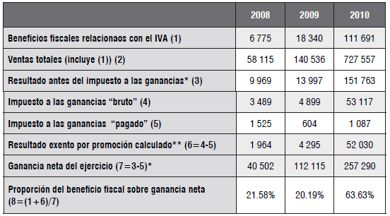 En el caso de este grupo, como en el anterior, es interesante estudiar el peso que tiene el beneficio promocional dentro del rubro de electrónica de consumo (Tabla 10). Como puede verse, al igual que en el caso de Mirgor, la suma de las devoluciones de IVA y ganancias supera ampliamente las ganancias netas del grupo. En el caso puntual de este grupo, también ha sido beneficiado con el "Programa de Financia-miento Productivo del Bicentenario" a tasa fija del 9,9 % (mucho menor que la inflación del período) por un monto de $100 970 000, como también por el programa "Conectar Igualdad" en 2011, por el cual fue seleccionado para fabricar 212 500 netbooks.