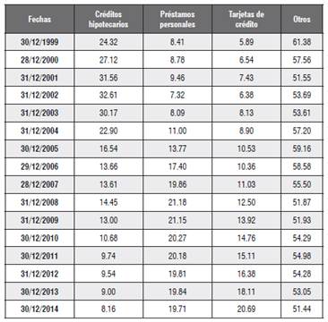 Tabla 2 Préstamos al sector privado en monedas nacional y extranjera, 1999-2014. Valores en porcentajes