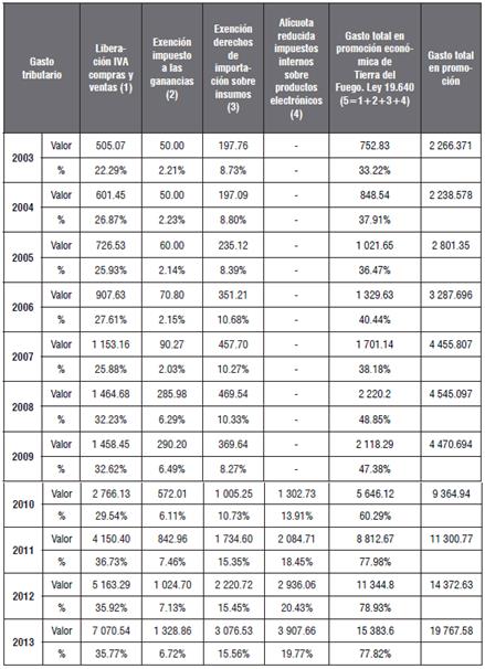 La promoción de la Ley 26 539 junto al Decreto 252/09 demostró la importancia de este Régimen para el Estado nacional. Esto puede corroborarse en la Tabla 3, que indica que, a lo largo de los últimos años, las medidas asociadas al Régimen de Promoción Económica de la Provincia de Tierra del Fuego pasaron a concentrar más de tres cuartas partes del total de los gastos tributarios originados en regímenes de promoción económica.