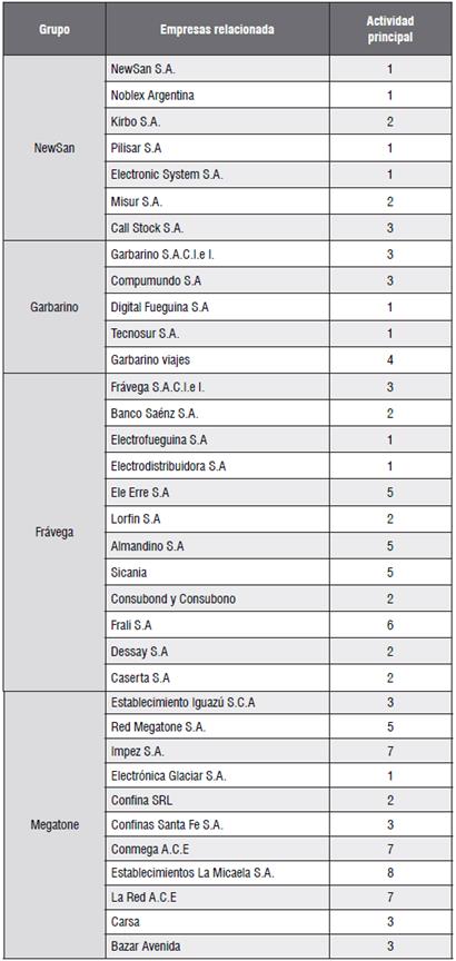 Por último, no hay que dejar de mencionar que los grupos aquí tratados, si bien presentan cierto grado de diversificación en sectores ajenos a la producción de electrónica de consumo, basaron su crecimiento en estos últimos sectores. Prueba de ello es que ninguna de las empresas vinculadas a sectores ajenos al de la electrónica de consumo pertenecientes a los grupos NewSan, Garbarino, Frávega y Megatone figura en el ranking de las 1000 empresas de mayor facturación. El caso de Mirgor-Caputo es distinto ya que encontramos empresas que figuran en el Ranking (no obstante, con una gravitación menor al de la electrónica de consumo).