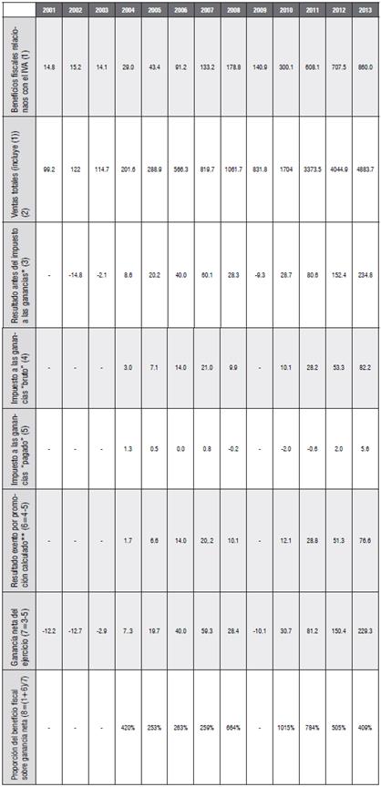 Tabla 8 Cálculo del peso del beneficio fiscal sobre la ganancia neta, 20012013. Valores en millones de pesos corrientes
