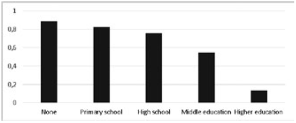 On the other hand, people with low levels of education are more likely to belong to the informal sector; the employed population that has at least one level of primary education presents a probability of 46.02% of belonging to the informal sector with respect to the higher level; likewise, in the case of secondary school, the probability is 43.01 %, for an average of 41.50% and if the individual does not have an education of 39.32 %. Figure 2 validates the importance of education as a determinant variable of informality, as expressed by the previous results, it is also observed that the theory of human capital explains the informality in the city of Villavicencio, as Becker (1983) and Villalobos and Pedroza (2009).