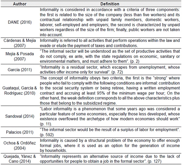 Table 1 shows some definitions, using the characteristics of the informal labor market. In particular, following Ortiz, Uribe and García (2007) and Galvis (2012), this research uses the DANE definition to determine the endogenous variable.