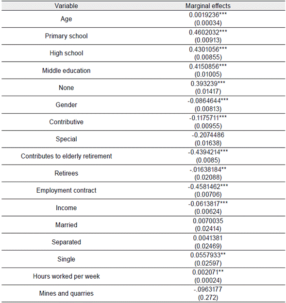 For the purpose of this research, DANE definition was used to determine those who are informal and those who are not. The used methodology was Maximum Likelihood (MV), a probit model was estimated, where the endogenous variable takes the value of one (1) if the individual is in the informal sector and the value of zero (0) if he is not. The exogenous variables are age, gender, level of education, marital status, branches of economic activity, worked hours per week, affiliation to the social security system (health and retiree), income and employment contract.