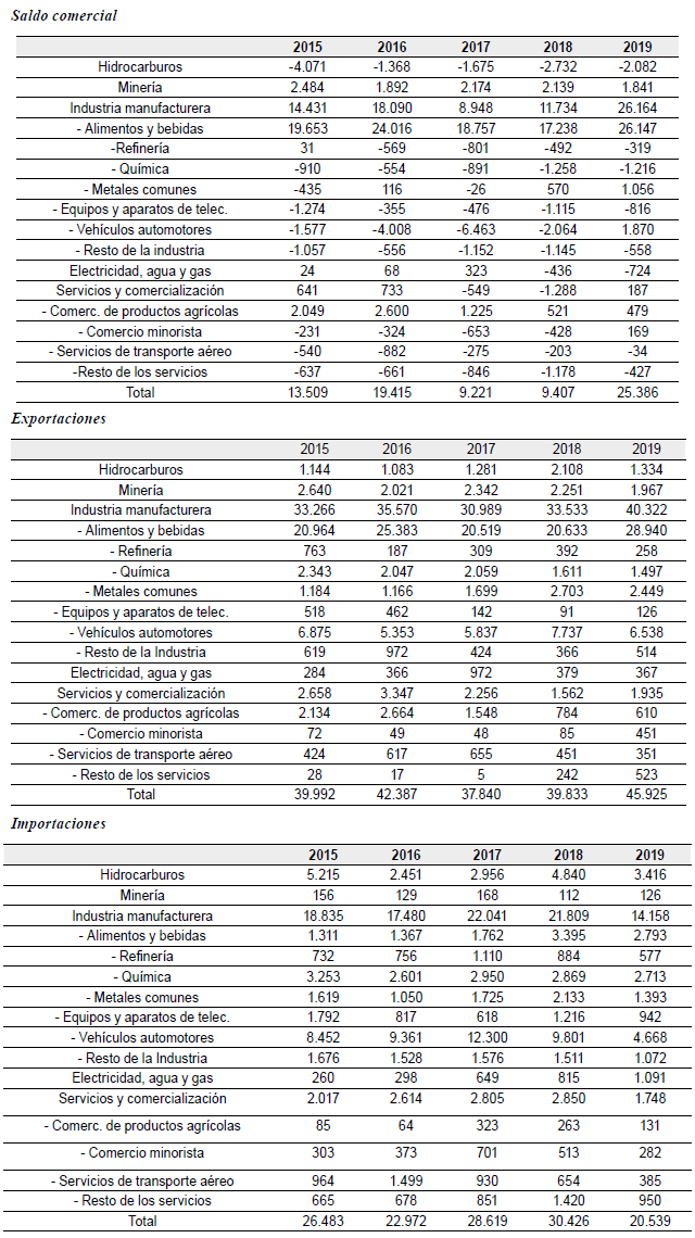 Tabla 3 Argentina. Evolución de las variables del comercio exterior de la cúpula empresarial* según el sector de actividad principal de las firmas, 2015-2019 (en millones de dólares)