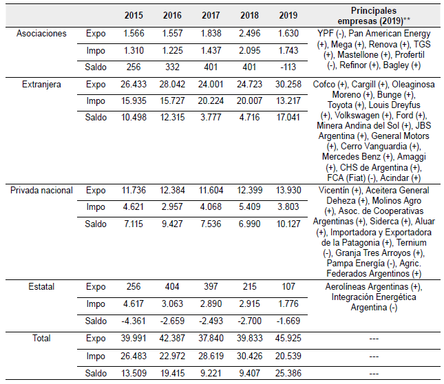 Al poner la mirada sobre la trayectoria comercial externa de las empresas privadas nacionales se corrobora que su peso relativo en las exportaciones totales de la cúpula prácticamente no se modificó durante los años en estudio (siempre se ubicó en torno del 30 %), mientras que su incidencia en las importaciones promedió el 16 %. Se trata de una fracción empresaria que, en términos generales, operó con importantes excedentes de comercio exterior (de hecho, en 2017 y 2018 superó al capital extranjero en cuanto al aporte neto de divisas por dicha vía). Esto se deriva, esencialmente, del papel de empresas pertenecientes a grupos económicos que se especializan en la producción y la exportación de distintos tipos de commodities (Vicentín, Aceitera General Deheza, Molinos Agro, Siderca, Aluar y Tecpetrol, entre las principales).