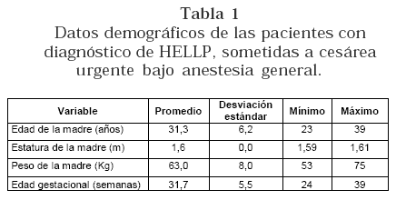 Previa aprobación por parte del comité de ética de la institución y consentimiento informado por parte de las pacientes y familiares, se realizó un estudio prospectivo descriptivo que incluyó a todas las pacientes sometidas a operación cesárea urgente, bajo anestesia general, con diagnóstico de preeclampsia severa complicada con Síndrome de HELLP (Deshidrogenada láctica > 600 U/ l, aspartato aminotransferasa >70 U/l y trombocitopenia (100000), durante el 2004 en la Unidad Materno Infantil de la Clínica Universitaria Bolivariana. Los criterios de exclusión fueron: sospecha de anomalías congénitas fetales y alergia conocida a propofol o remifentanil.
