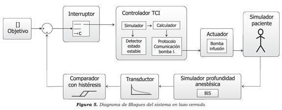 De esta forma se ha diseñado un sistema de control TCI en lazo cerrado , en el cual el brazo de realimentación consiste de una lectura del BIS, un transductor BIS"concentración y un comparador en modo de simulación.