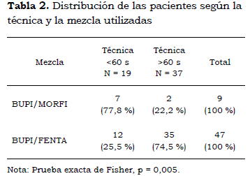 Se incluyeron en el presente estudio 60 casos; 4 de estas pacientes (6,7 %) tuvieron anestesia regional fallida: 3, por dosis insuficiente (2 pacientes del grupo <60 s, y una del grupo >60 s), y 1, por dificultad técnica, por lo cual se administró anestesia general.