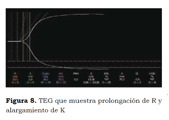 Transcurridos 8 días, por el alto riesgo de sangrado intraoperatorio, antes de iniciar la segunda cirugía se toma TEG, que muestra prolongación de R y alargamiento de K (Figura 8).