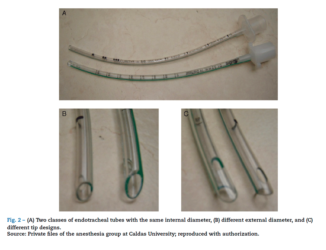 Cuffed tubes have found their way into pediatric anesthesia. Progress has been made in equipment standardizationand optimal design. At present, there are marked differences among the different manufacturers in terms, for example, of the external diameters used for the same internal diameter and cuff design.14,15 Weiss found 15 types of tubes from four different manufacturers17 (Fig. 2).