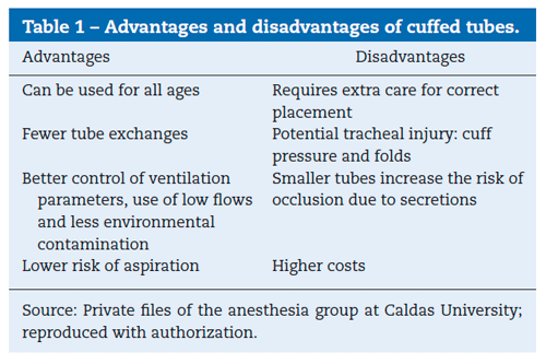 Today, cuffed tubes are low pressure/high volume tubes, and their advantages include low gas flow, less contamination, lower risk of aspiration, better control of ventilator parameters, and a lower number of intubations11,12 (Table 1).Weiss et al., in a study of 2200 of children under 5, reported a lower number of ETT exchanges when cuffed tubes were used, as compared with uncuffed tubes (2.1% vs. 30.8%), and less trauma to the airway.14