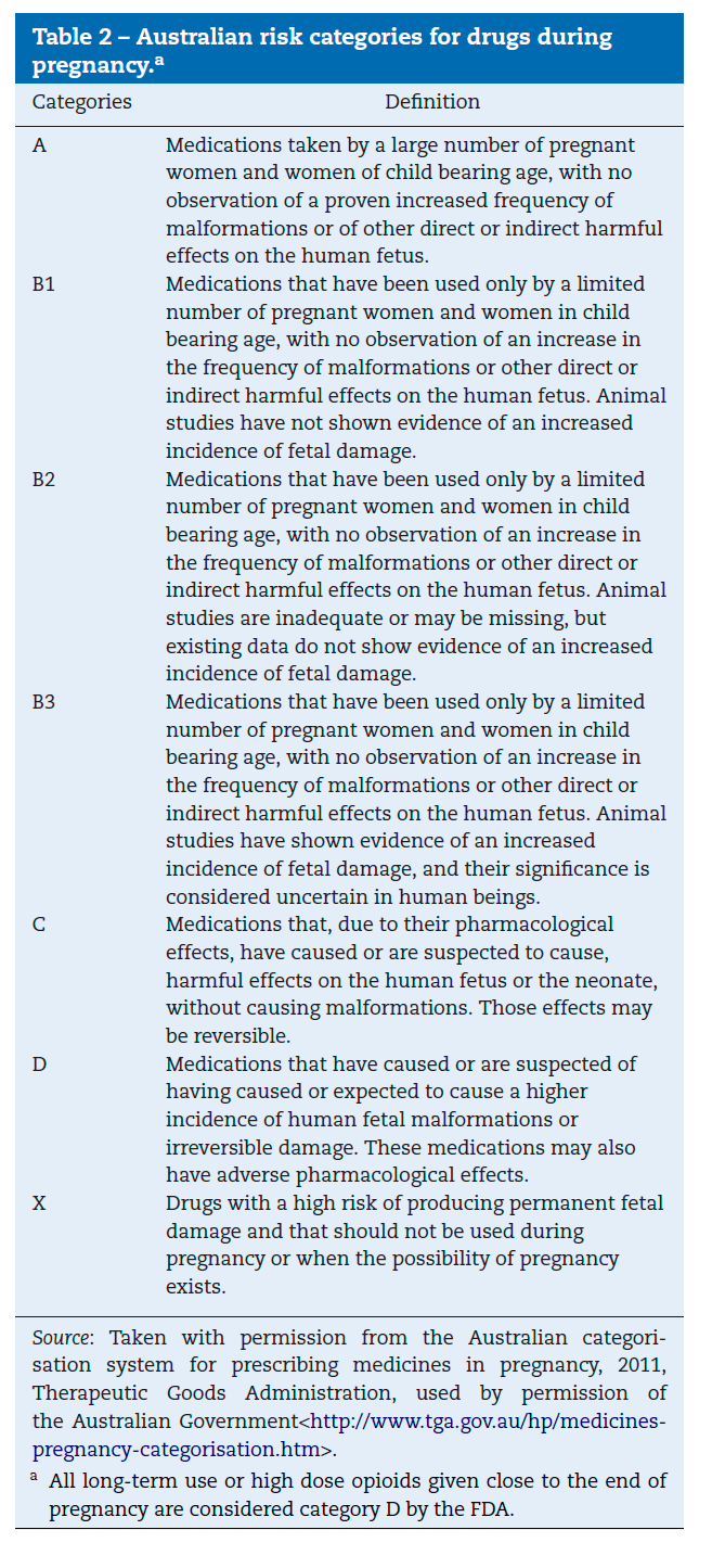 Australia has a different classification system (Table 2)20 that takes into consideration the known harmful events for the developing fetus, including birth defects, effects that may or may not be reversible, and problems later in life. Overdose and occupational exposure to medications are not taken into