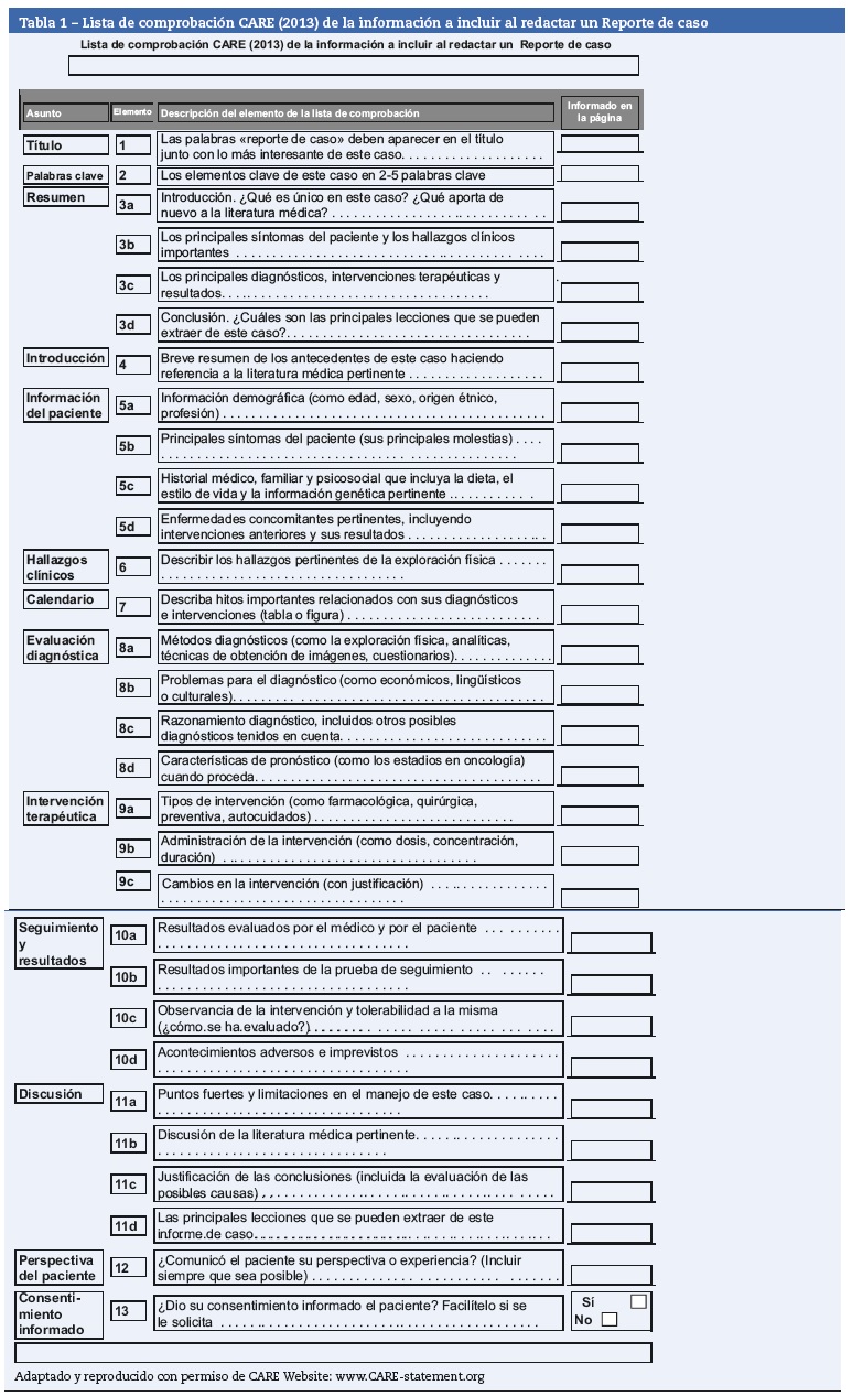 Con respecto a CARE, la RCA busca mejorar también la calidad de los reportes de casos clínicos. Para tal fin, en la tabla 1 se presenta la lista de comprobación modificada de CARE-2013, recientemente adoptada por otras revistas a nivel mundial. Dicha lista da a conocer los elementos que son necesarios para explicar mejor el problema que abarca el estudio y su posible solución. Las guías que adopta la RCA deben tomarse como una oportunidad para mejorar la calidad y la cantidad de información documentada, que su vez permitirán evaluar mejor las deficiencias y las fortalezas del estudio presentado.