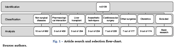 Resultados: La búsqueda arrojó 3.139 artículos desde 1962. Se clasificaron en 8 categorías: 862 (27,6%) asociados a enfermedades no quirúrgicas, 294 (9,4%) a trasplante hepático, 711 (22,6%) a investigación básica, 174 (5,5%) a obstetricia, 228 (7,3%) a cirugía cardiovascular, 177 (5,6%) a otras cirugías, 234 (7,4%) a técnicas anestésicas y 459 (14,6%) a fármacos.